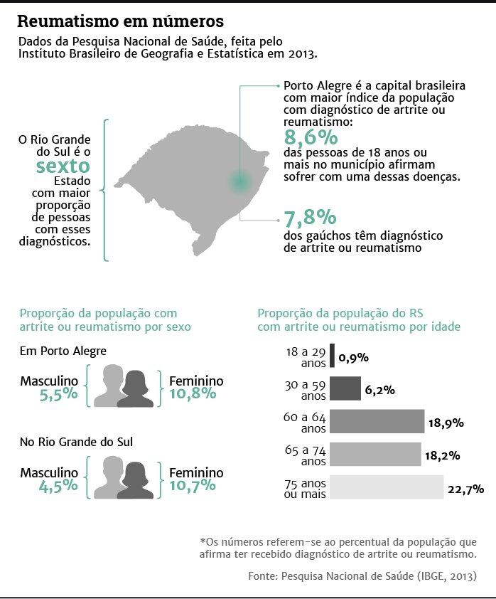São poucos os dados disponíveis sobre as doenças reumáticas no Brasil. O Ministério da Saúde estima que mais de 12 milhões de pessoas no país têm prejuízo na movimentação associado a esses males. Porto Alegre é a capital brasileira com maior índice da população que sofre com artrite ou reumatismo: 8,6% das pessoas de 18 anos ou mais afirmam ter recebido esse diagnóstico, conforme a Pesquisa Nacional de Saúde, feita pelo Instituto Brasileiro de Geografia e Estatística (IBGE) em 2013. No Rio Grande do Sul, 7,8% dos gaúchos têm diagnóstico de artrite ou reumatismo.
